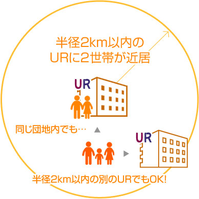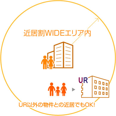 直径または3親等内の親族で、近居するどちらかが上記条件に当てはまる場合は、新たに入居するUR賃貸住宅に近居割・近居割WIDEが適用されます。